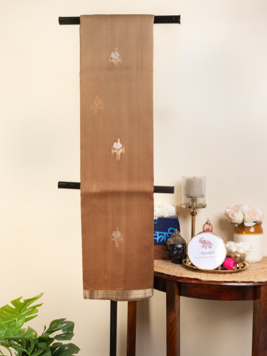 A mocha brown base kissed with gentle zari lines — minimal yet luminous, crafted to echo quiet elegance.