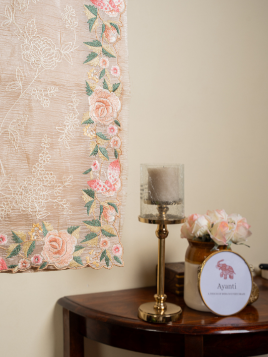 A beige crush tissue saree adorned with delicate floral embroidery across the body and a detailed floral-butterfly border. Lightweight, lustrous, and gracefully festive. This saree captures light beautifully while maintaining an easy, comfortable drape.