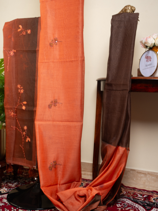 A dual-toned soft cotton saree in burnt orange and coffee brown, delicately embroidered with minimal floral motifs. Lightweight and graceful, it blends earthy warmth with understated elegance.