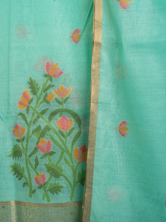 Soft as a breeze, this mint-green soft cotton saree is adorned with woven lotus butis and a subtle zari border. Light, breathable, and effortlessly elegant β perfect for long festive days.