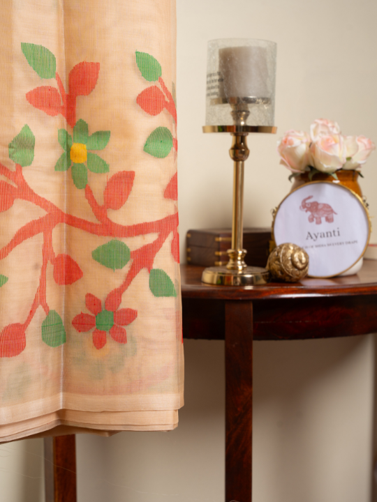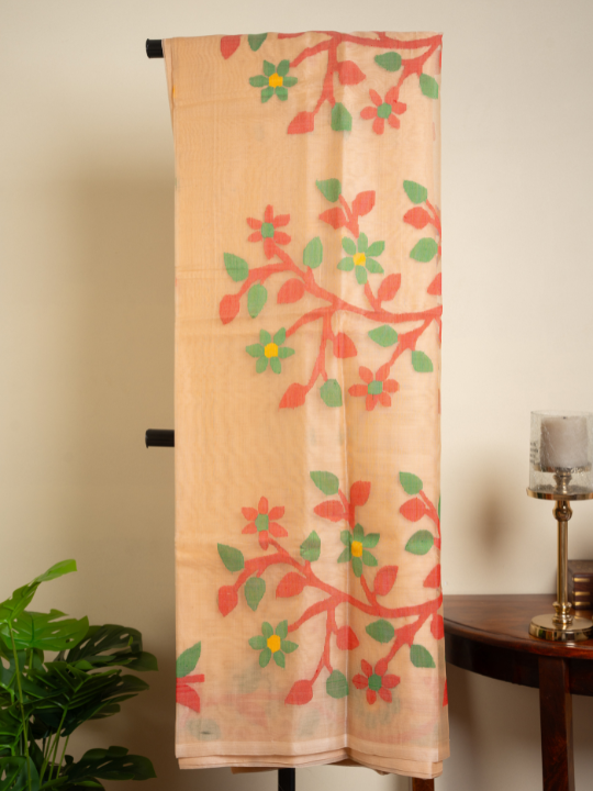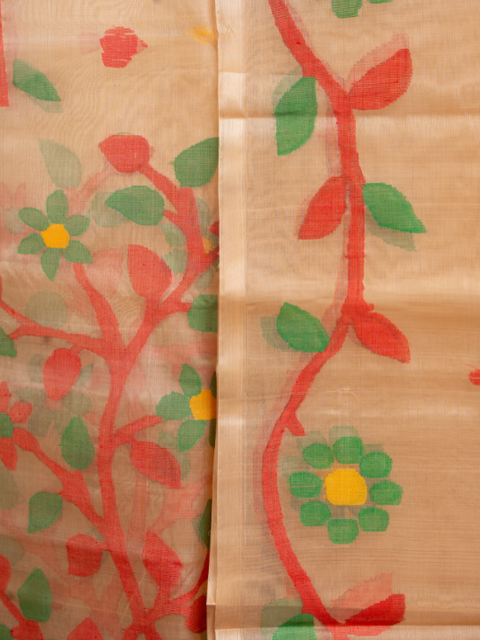 A pure silk muslin saree featuring intricate Jamdani floral weaving in red, green, and yellow — light as air, yet rich in craft and colour. The soft beige base enhances the detailed Jamdani work from West Bengal.