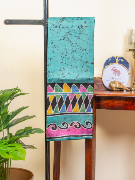 This saree features a turquoise base with crack batik detailing and a vibrant multicolour geometric border and pallu β a striking blend of craft and colour. The vibrant hues and textured batik create a lively and artistic statement piece.